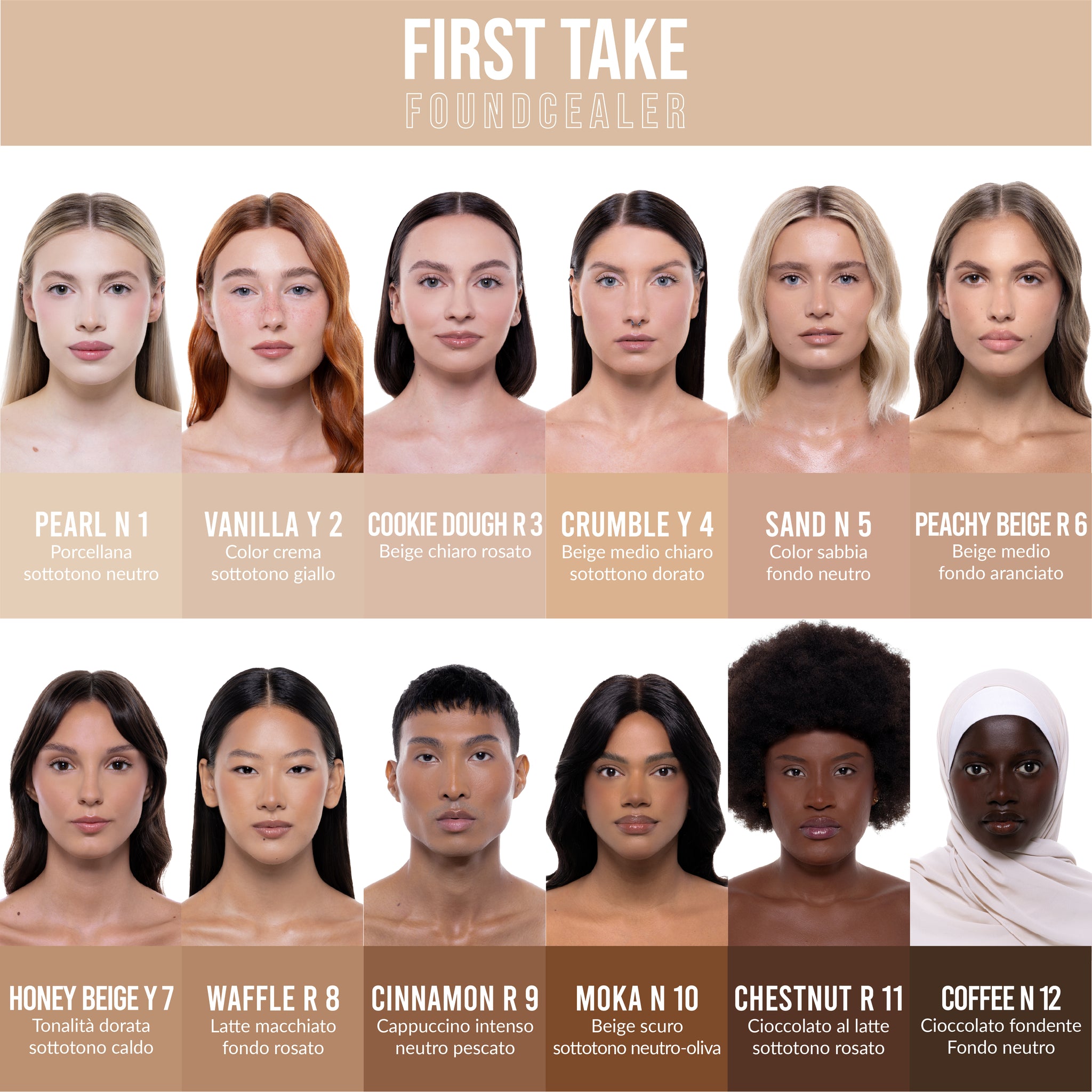 FIRST TAKE FOUNDCEALER COOKIE DOUGH R 3 is a blurring foundation-concealer in a porcelain shade with a neutral undertone.