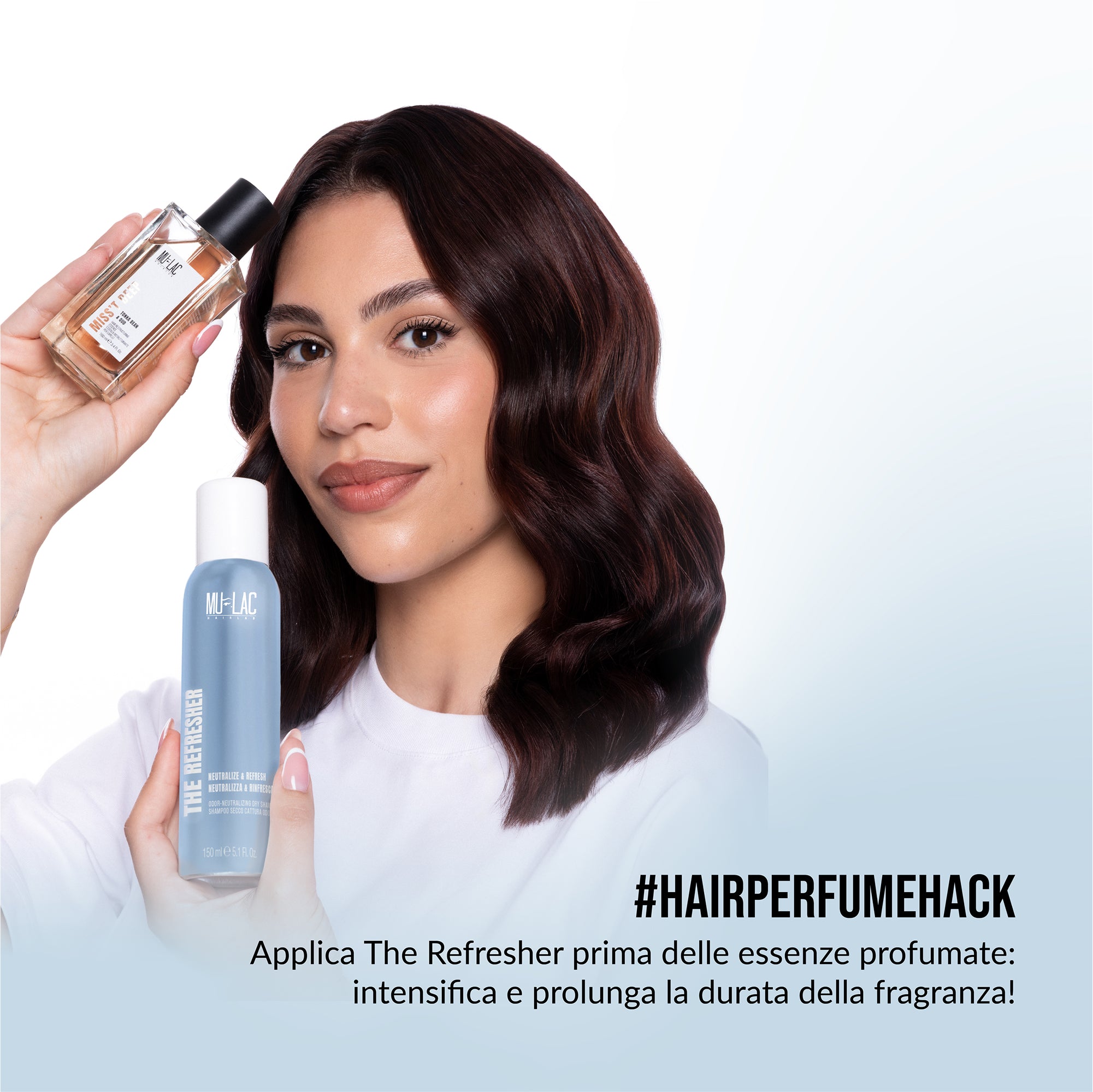 Shake The Refresher can well and spray the product evenly from about 20 cm away over your entire head of hair. Let it sit for 2–3 minutes, then brush through to distribute the product and remove any residue. As a second step, mist Miss’t onto the hair, focusing on the lengths to intensify the fragrance and the restructuring effect. 💡 Tip: Use The Refresher before going out to prevent odor absorption, or after returning to neutralize unwanted smells. Finish with Miss’t for an extra boost of fragrance and vitality.