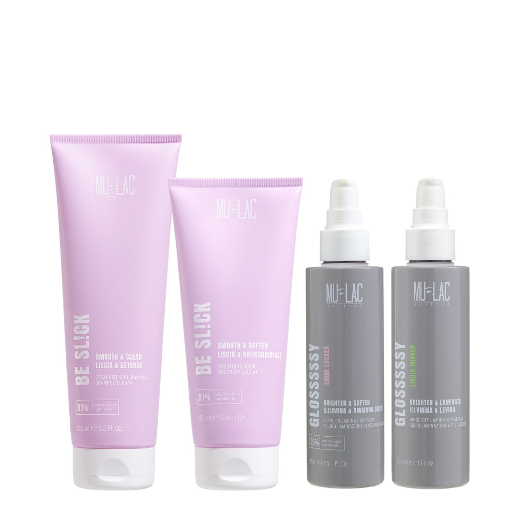 1. Apply BE SL!CK straightening Shampoo to wet scalp and hair, massage gently and rinse thoroughly. 2. For a boost of mirror-like shine, distribute GLOSSSSSY Liquid Mirror on lengths and ends. Leave on for 5 minutes, then rinse carefully. 3. Follow with BE SL!CK Smoothing Mask on towel-dried hair. Leave on for a few minutes and rinse well. 4. Complete the routine with GLOSSSSSY Shine Locker on lengths and ends, either on damp or dry hair, then style as desired. 5. Blow-dry your hair and use a straightener: the final touch to keep it shiny and silky for longer! ✨ Used together, the products in the Routine Laminazione amplify the straightening and glass hair effect, leaving hair soft, shiny and frizz-free until the next wash.